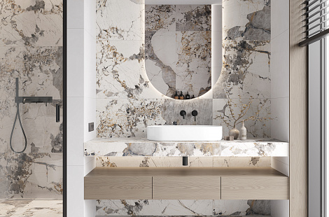 - Кафельная плитка под мрамор относится к классическим решениям, покорившим вкус многих покупателей. Имитация натурального оформления уместна в различных интерьерах, смотрится изысканно и величественно.